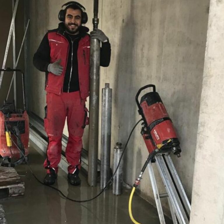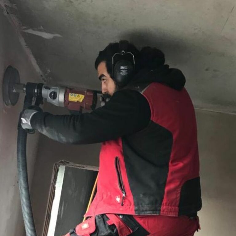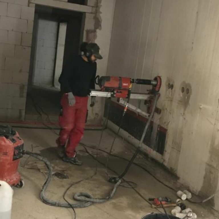 Kernbohrungen durch armierten Beton für die Steckdosen 10 cm tiefe Bohrung 80 mm Durchmesser